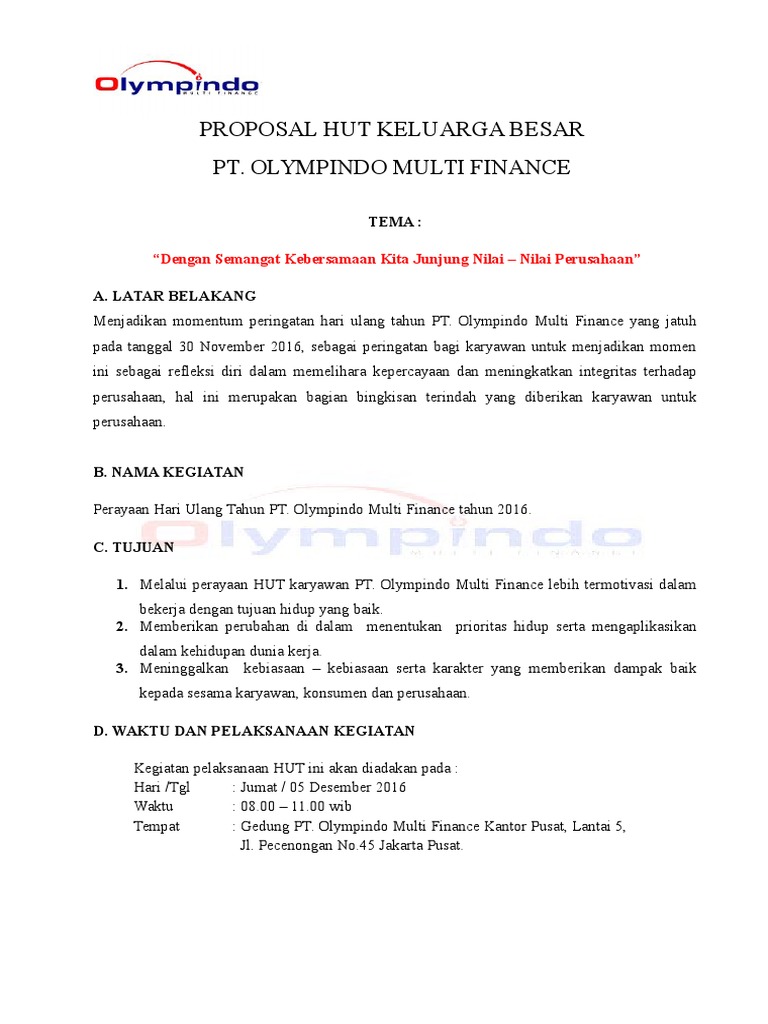 Download Proposal Ulang Tahun Perusahaan PDF 1000 MB - SamPDF Unduh Proposal Ulang Tahun Perusahaan PDF secara gratis di SamPDF. Dalam rangka ikut merayakan acara ulang tahun sebuah perusahaan kami disini telah merangkai beberapa alternatif acara yang akan diusung sesuai dengan tema perusahaan tersebut. Contoh Teks MC Formal Contoh Teks MC HUT Kemerdekaan RI 17 Agustus.