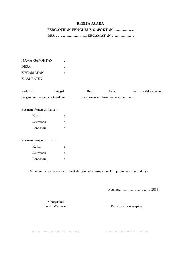 Sesuai Anggaran Dasar Koperasi setiap beberapa tahun sekali diadakan pergantian pengurus atau pengawas. Demikian berita acara ini dibuat sebenar-benarnya anggota hadir dalam kesepakatan Reorganisasi Kelompok Tani Ternak terlampir sebagai dasar untuk penetapan Pengurus Baru Kelompok Tani Ternak oleh Kepala DesaKelurahan Dolokgede. Contoh berita acara pergantian struktur organisasi berita acara pada hari jum at tanggal 30 april 2014 pukul 20 00 wib tempat sekretariat karang taruna rw 012 telah diselenggarakan musyawarah besar karang taruna yang dihadiri unsur unsur pengurus karang taruna unit rw 012.