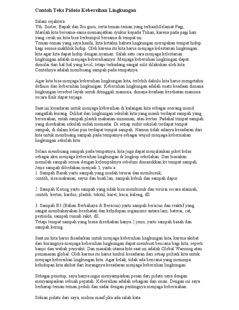 Contoh Teks Ceramah Tentang Kebersihan Lingkungan. Posted by Elderian Posted on 1557 with No comments. Pidato Tentang Sampah Plastik.
