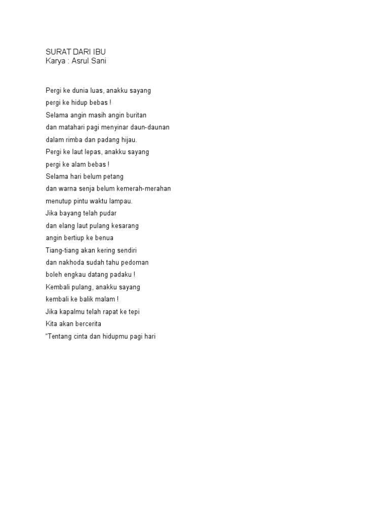 Alam bebas kt. Pergi ke laut lepas anakku sayang mencari pengalaman dan menambah wawasan laut lepas kata simbol dunia masyarakat ilmu pengetahuan kehidupan Baris 2 pergi ke alam bebas. Rendra dalam puisi Surat Kepada Bunda mengisahkan kehidupan yang dialami seorang anak laki-laki yang telah menemukan jodohnya dan meminta izin kepada ibunya untuk menikahi kekasihnya serta.
