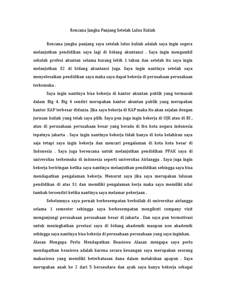 Dan disitulah saya akan kembali mengabdi. Saya ingin mengambil sekolah profesi akuntan selama kurang lebih 1 tahun dan setelah itu saya ingin melanjutkan S2 di bidang akuntansi juga. Contoh Essay Rencana Setelah Lulus Kuliah expository essay on benefits of sports hero cycles case study pilot fatigue case study Thank you for delivering this essay so fast.