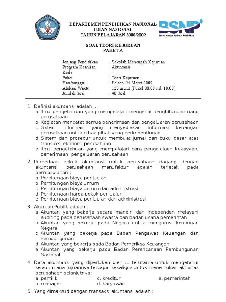 Soal Teori Kejuruan Akuntansi Paket A 2008 2009